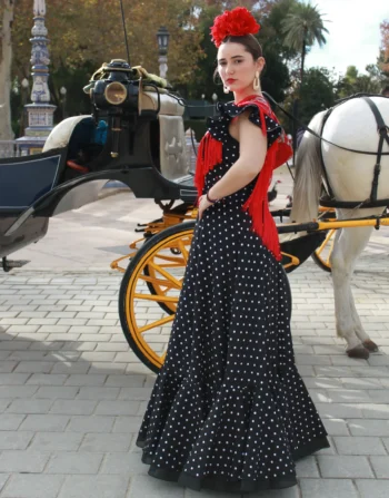 El Eva es un traje de flamenca elegante y cómodo, con corte a la cadera, falda canastera y mangas flamencas. Perfecto para ferias y romerías.